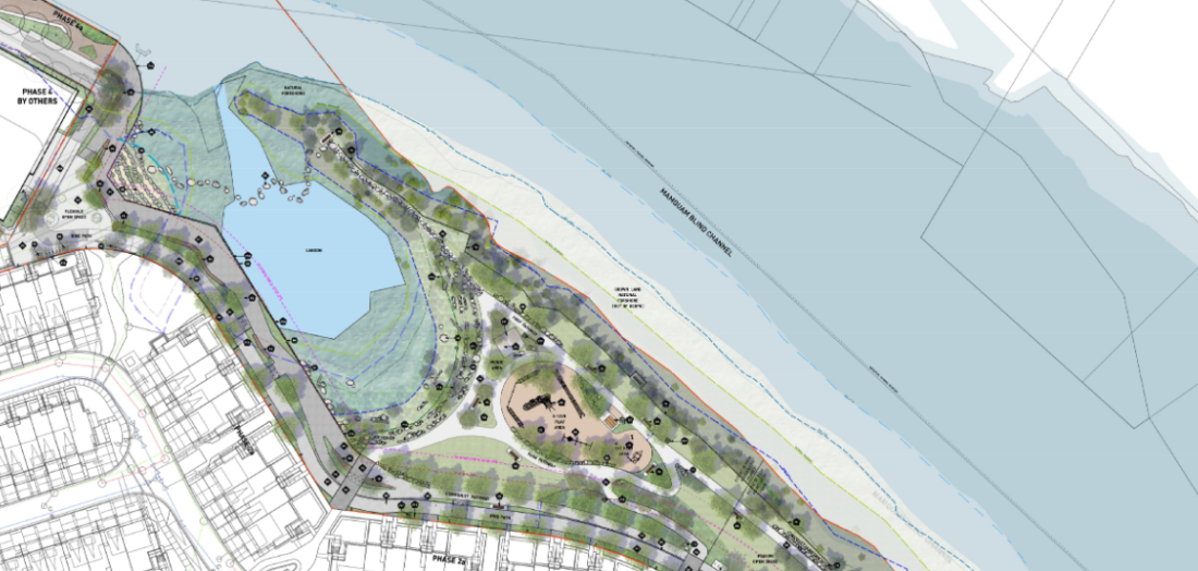 The park will provide public gathering space close to the boardwalk and have other features such as playgrounds and a pump track along with trails and pathways. Owned by the District, it will also include a tidal lagoon, lookout points, and active play areas as well as natural areas and a restored shoreline. The park will be accessible from downtown via the proposed pedestrian bridge crossing to Victoria Street.