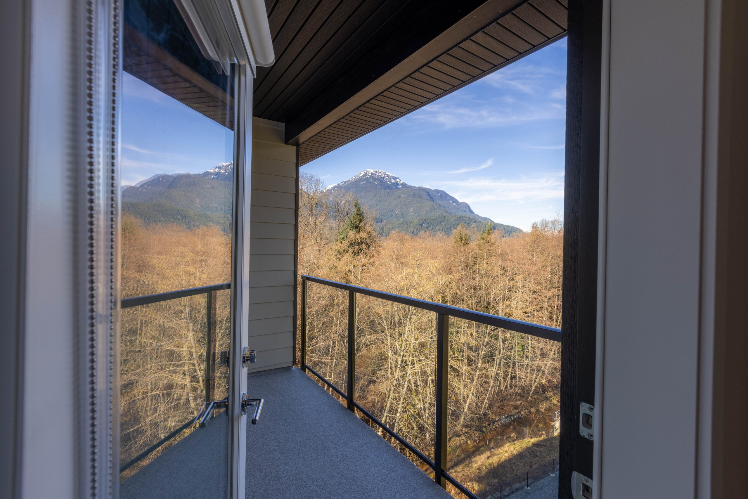 The homes themselves are spacious — especially for below-market rentals — with bright open-concept layouts, vinyl plank flooring throughout, modern bathrooms with soaker tubs and quartz vanities, and bedrooms sized to fit a queen bed with built-in storage. Market rate units also include stainless steel appliances. Large windows on either the mountain or tree side frame the views, and the top-floor amenity lounge opens onto a large outdoor deck — ideal for summer BBQs and resident gatherings.